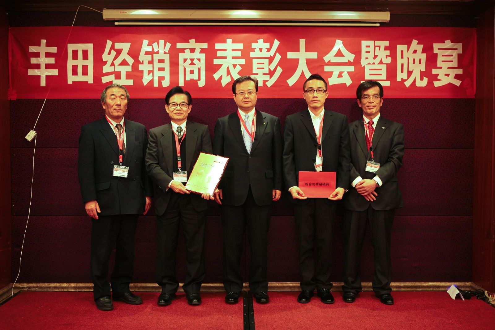 2012年2月9日-2月10日、2012年度豐田產(chǎn)業(yè)車輛(TMHS)經(jīng)銷商峰會隆重召開,出席大會的有來自全國的豐田產(chǎn)業(yè)車輛經(jīng)銷商和豐田自動織機,豐田通商等代表近百余人。9日晚上,全體與會代表于廣州參加了大會晚宴,在山北董事長熱情洋溢的干杯致辭之后,大家共同舉杯為過去一年驕人的銷售成績慶祝,隨后2011年度優(yōu)秀經(jīng)銷商(金豐公司)表彰儀式正式開始,由日本總部的豐田產(chǎn)業(yè)車輛集團佐佐木總裁,TMHS山北董事長,植田總經(jīng)理共同向2011年度優(yōu)秀經(jīng)銷商頒發(fā)了獎牌并合影留念。